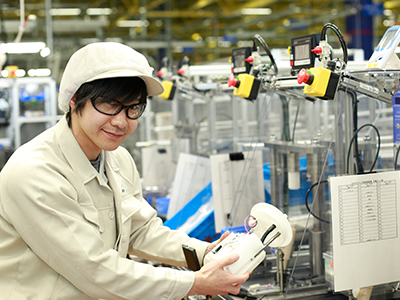 生産技術課に所属しています。生産ラインの構築や改良、生産工程における問題の改善、必要な設備導入の検討、製造原価の企画、安全管理など業務は多岐に渡り幅広い知識が必要な部署です。「良い品質を保って生産するためには、設備をどのような仕様にすればよいのか」「より効率的に製造するための環境は整っているか」「より低コストで製造する為の改良点はあるか」「作業する方が安全に作業できているか」「この工程で納期通りに製造できるか」などを常に考え、計画を立てたり提案や改善を行っています。