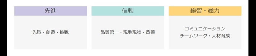 3つの柱となるキーワード、先進、信頼、総智・総力は、脈々と先輩社員から後進へと受け継がれ、京三マンの拠り所となっています。