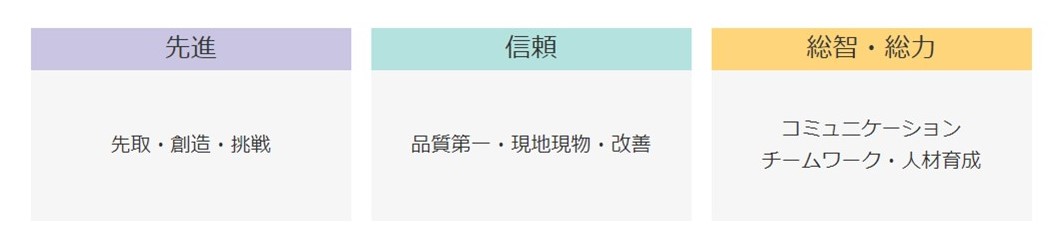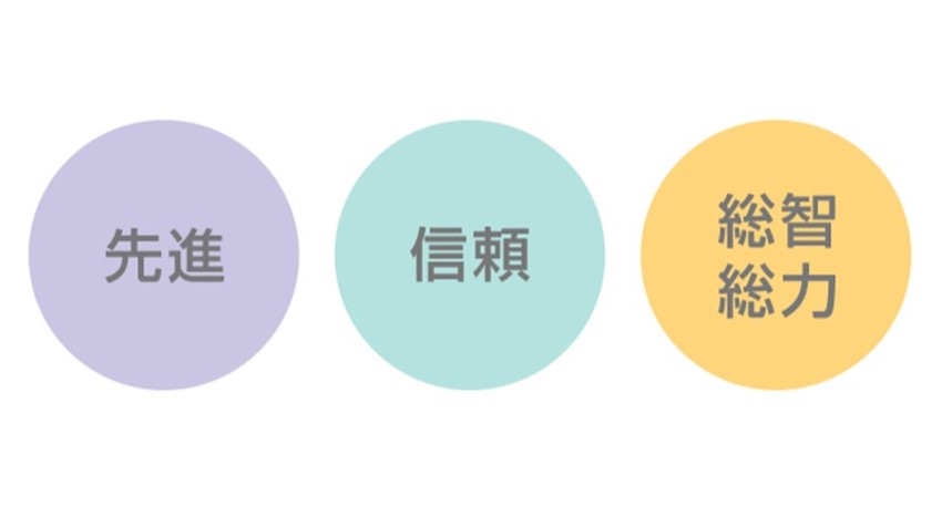 3つの柱となるキーワード、先進、信頼、総智・総力は、脈々と先輩社員から後進へと受け継がれ、京三マンの拠り所となっています。