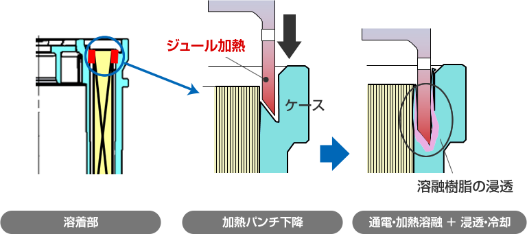 瞬間的に大電流を流すことによりヒーター熱を発熱させ、樹脂ケースを溶かすインパルス溶着。これにより、従来必要だった材料や設備が必要なくなり、省面積、省エネルギーを実現しています。